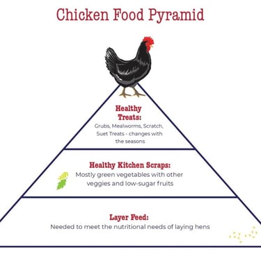 As responsible chicken keepers, we want to be assured that we are doing our best for our birds, and having a good nutritional plan is a major part of good flock management. Above is a food pyramid that is a good visual to help determine what and how much you should feed. For chickens under 20 weeks of age, you want to substitute a starter/grower feed for the layer feed, but even young chicks can use this as long as they are small bites, and you provide grit for them.